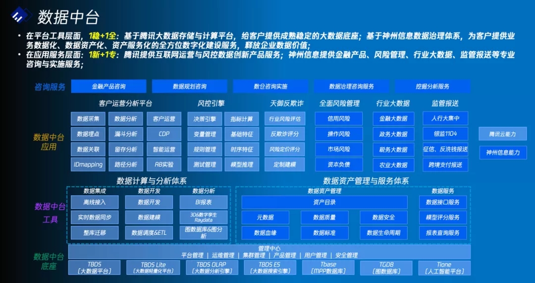 数据中台联合方案充分结合双方优势,围绕数据的“采、存、建、用、管”全生命周期流程,实现数据标准化、智能化、资产化、服务化,快速满足多样性的业务需求,助力金融机构释放数据价值,加速数字化转型。其中,在平台工具层面,基于腾讯云大数据处理套件TBDS,为客户提供成熟稳定的大数据底座;基于神州信息数据治理体系,为客户提供业务数据化、数据资产化、资产服务化等全方位数字化建设服务,释放企业数据价值。在应用服务层面,腾讯云提供互联网运营与风控数据创新产品服务;神州信息则提供涵盖金融产品、风险管理、行业大数据、监管报送等领域的专业咨询与实施服务。